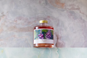 このコーディアルの特徴は、瓶の中に注ぎ込んだ「花の密度」。シロップの液量と同量、それ以上となる圧倒的な花びら量にあります。